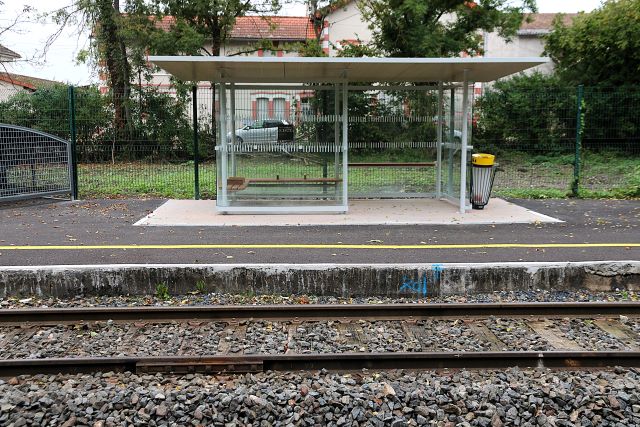 Commentaire photo - Ce nouvel abri offre aux usagers deux bancs et un "appui ischiatique" venant compléter les six sièges avec dossier présent à l'intérieur du BV curieusement ouvert tous les jours de la semaine en 2025 (quand tant d'autres et non des moindres présentent portes closes). Bien entendu, les guichets demeurent fermés. | |