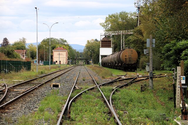 Commentaire photo - La trituration des graines est réalisée à l'autre bout de la ville, ce qui conduit à un "brouettage" vers la gare, au moyen de véhicules roulant, on l'espère, au Diester. Les installations, établies vers 1980, sont vues en direction de la crête forézienne, visible au fond. | |