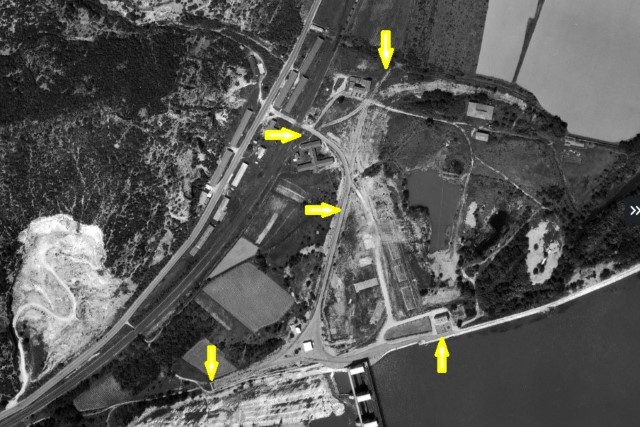 | Commentaire photo - Les flèches aident à repérer le parcours en "Z" avec deux tiroirs de la voie d'approvisionnement du chantier, ici en cours de démantèlement en 1962. La maisonnette du PN 6 est encore debout. | |