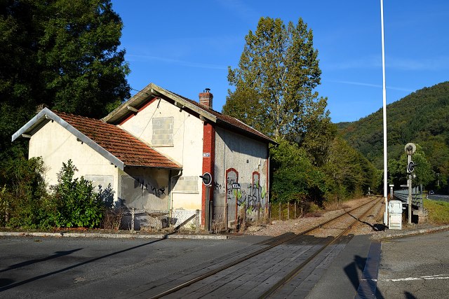 Commentaire photo - Avant d'être déviée au nord de la voie ferrée dans les années 1960, la N 89 franchissait ici la ligne de Brive à Tulle. La maisonnette, parallèle à la voie (une habitude dans cette vallée étroite), a été détruite après 2014. La direction de Tulle est à droite. | |
