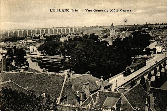 Commentaire photo - A droite, peu coutumier du site propre, un Tramway de l'Indre se dirigeant vers Saint Benoît du Sault franchit la Creuse en empruntant la chaussée de l'ex-N 151. Au loin, vers l'aval, les arches du viaduc PO soulignent l'horizon. | |