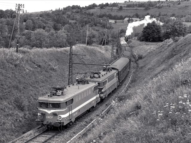 | Commentaire image : Afin d'éviter un tête-à-queue à Neussargues et de rendre possible le rebroussement à Garabit, ce convoi, en provenance de Clermont Ferrand, s'est doté avant l'heure d'un "moteur hybride". La rame ondule ici un peu au nord du Sailhant. | ![]() |