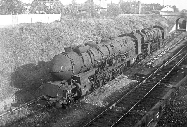 Au nord de la gare de Cosne, deux 241 A ont été reléguées sur une voie de tiroir. La photo est prise du pont-rail (qui ne tardera pas à être détruit) par lequel l'ancien tacot de Saint Amand franchissait les voies du grand réseau. A l'extrême droite, on aperçoit le pont-route de la rue Saint Lazare (un clin d'œil au Siège du PLM, puis de la SNCF).
