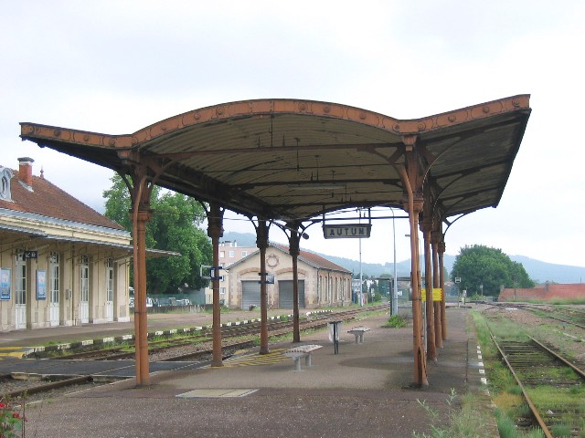 | Commentaire photo - Autun en emporte l'auvent. Les sudistes du Morvan, ferroviairement, ne sont pas à la fête. Ici, la toiture a perdu ses ornements. La direction d'Etang est au fond. | |