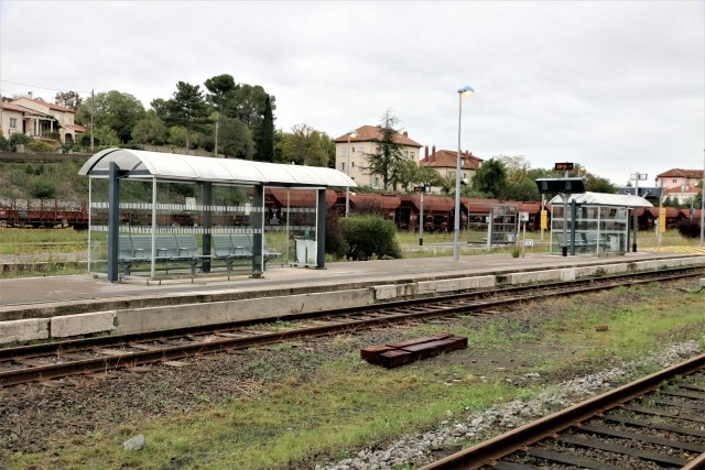 | Commentaire photo - Le quai central et le quai extérieur furent dotés d'abris-parapluies caractéristiques, eux-mêmes dominés par une marquise transversale couvrant la traversée des voies. On distingue les trois abris vitrés contemporains qui ont bien du mal à meubler l'immense plateau, généralement désert, de la gare d'Alès. | |