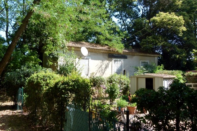 | Commentaire photo - Sur le côté, la plaque de gare identifie toujours l'abri complété sans doute d'une lampisterie. La direction d'Arles est à droite. | |