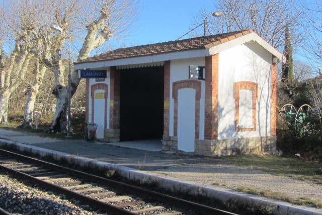| Commentaire photo - Le 31 décembre 2023, trois TER étaient déjà annoncés supprimés en début de matinée : une journée "ordinaire", augurant mal de 2024. L'abri est décalé vers le sud par rapport au BV, sans doute en raison de l'accès à la gare départementale établie parallèlement à celle du grand réseau, vers l'est. La direction d'Avignon est à gauche. | |