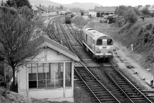 | Commentaire photo - Hérité du PLM, ce poste, détruit au début des années 2000, se situait à l'entrée côté Dracy de la gare d'Autun. On voit manœuvrer l'une des 4 locomotives anglaises "Class 20" achetées par les CFD pour assurer la traction sur la ligne d'Avallon. | |