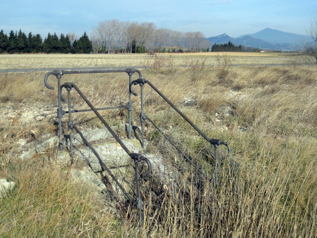 | Observations - La section d'Orange à Carpentras est le plus souvent en léger talus au-dessus de la plaine inondable. D'innombrables petits aqueducs la traversent, jouant un rôle de décharge ou surplombant ici un fossé de drainage, là un canal d'irrigation. Originalité : le tablier et les culées sont munies d'une triple rembarde métallique sur laquelle le temps n'a pas de prise. | |
