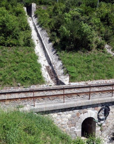 | Commentaire photo - A quoi ressemblerait la ligne si elle était construite aujourd'hui? A un gâchis de béton défigurant la Porte des Cévennes, alors que la pierre la magnifie. La modernité a néanmoins infecté quelques claveaux avec des câbles disgrâcieux. La direction d'Anduze est à droite. | |