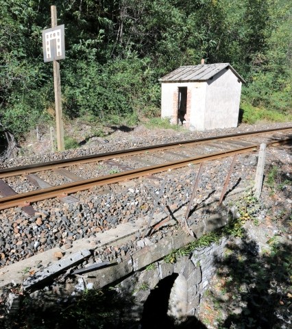 | Commentaire photo - Le panneau caractéristique annonce le tunnel de Pourcharesses, en direction de la Bastide. Au beaux jours de la traction vapeur sur le PLM, les "agents du chemin de fer" devaient grouiller sur la ligne. | |