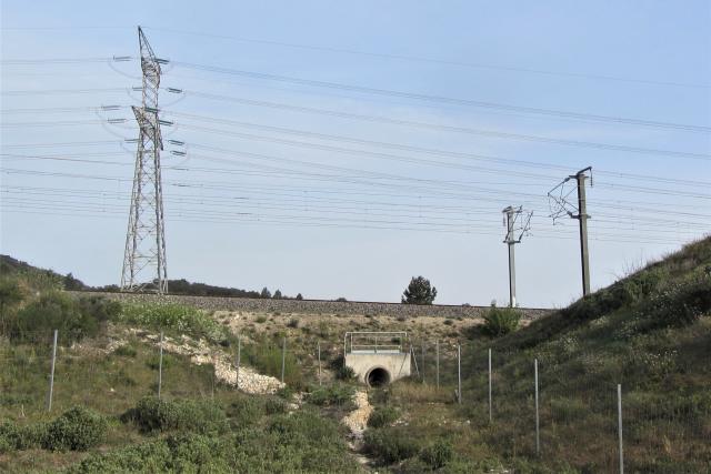 | Commentaire photo - Déjà ravagées par les incendies et éventrées par la LGV, ces collines du Gard rhodanien se voient aussi hérissées de piquets, de poteaux et de pylônes, coupées par des grillages, et sans autre horizon que des câbles électriques. France, tes paysages sont morts. La direction de Valence est à droite. | |