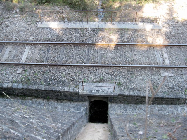| Commentaire photo - Après n'avoir quasiment pas connu d'entretien pendant un demi-siècle, les fossés de la ligne sont en cours de curage, tandis que les aqueducs se voient dégagés manuellement par une nouvelle génération de mineurs cévenols. La direction d'Anduze est à droite. | |