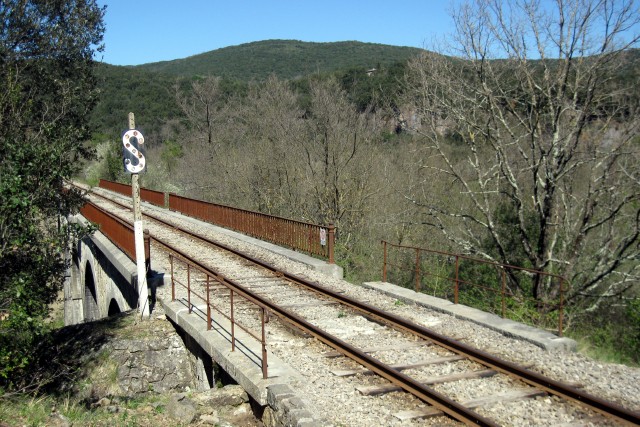 | Commentaire photo - Ce petit ouvrage, qui précède, au premier plan, le viaduc des Doucettes, livre passage à un fossé dallé chargé de drainer les eaux d'un fort versant, dont le flux, parfois torrentiel, aurait pu déchausser la proche culée. La photo est prise en direction de Saint Jean du Gard. | |