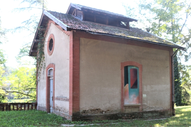 | Commentaire photo - Une peinture en trompe l'œil orne en fait la façade. Sur le pignon, un trait marque le niveau atteint, le 3 mars 1930, par une terrible crue du Tarn. | |