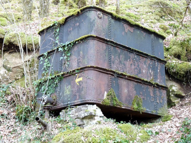 | Commentaire photo - Le tacot s'arrêtait en plein bois, en pleine courbe et en pleine rampe pour s'abreuver de l'eau régénératrice d'une source providentielle. Remarquer, en bas à gauche, le "col de cygne", toujours en place. | |