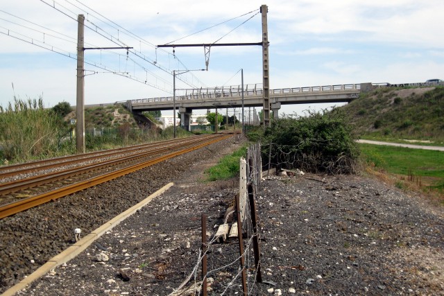 | Commentaire photo - Entre le pont de la déviation de la D 612 et l'ancien passage à niveau n° 66 (derrière le photographe), la plate-forme élargie et le poteau-béton en retrait de la voie impaire témoignent de l'ancien embranchement des salins de Frontignan, qui s'étirait le long de la ligne de Tarascon à Sète. Les quelques wagons laissés puis repris par la manœuvre furent longtemps approvisionnés au moyen de berlines Decauville issues du siège de l'exploitation (situé à 1300 m vers la droite). A la fin, un tracteur et une remorque assuraient le service. | |