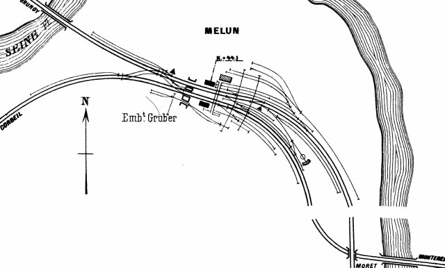 | Commentaire image : Ce plan de 1904 met en évidence l'embranchement de la Brasserie Grüber, qui, pour des générations de voyageurs, fut le signal fort du passage à Melun. | ![]() |