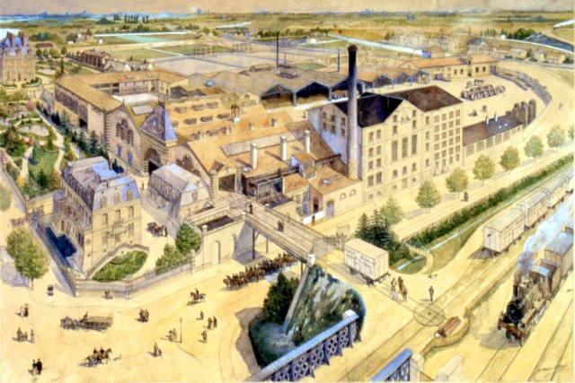 | Commentaire photo - Cette estampe montre bien l’embranchement de l’usine, qui date des années 1897-1900, époque de la mise en service de la ligne de Corbeil à Melun, que l'on distingue à droite, avec un train roulant à contresens. L’entreprise approvisionnait par voie ferrée les céréales pour la boisson et, plus tard, le verre nécessaire à la fabrication des bouteilles. Le chemin de fer assurait aussi ses expéditions. On remarquera, au fond, à gauche, le château familial de la famille Grüber, qui s'est fait du blé avec de l'orge. | |