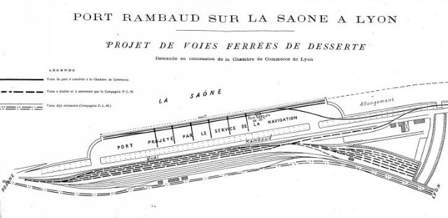 | Observations : Mis en service le long de la Saône après la première guerre mondiale, puis progressivement étendu vers l'amont et vers l'aval, le port Rambaud est abandonné à partir de 1985 au profit du port Edouard-Herriot. Aujourd'hui intégré au nouveau quartier de Lyon_Confluence, ses quais sont devenus une zone de loisirs et de promenade. | |