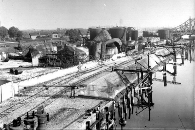 | Commentaire image : En bonus, cette vue du port pétrolier anéanti par l'incendie volontaire du 18 juin 1940. Le secteur a-t-il été convenablement dépollué avant sa reconversion en quartier high-tech? En haut à droite, on aperçoit l'extrémité du viaduc de la Mulatière. | ![]() |