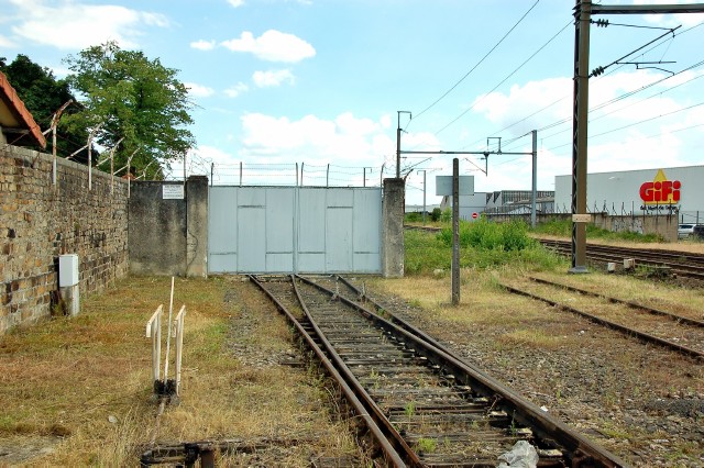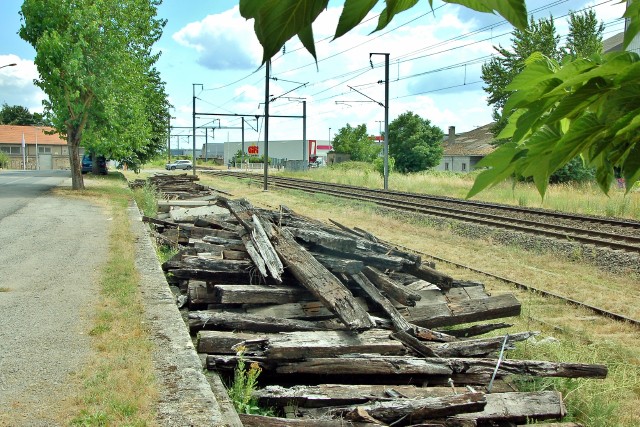 Commentaire image : Le long du mur de la Base de Soutien du Matériel, un tiroir permettait de refouler des wagons sur une voie qui longeait la zone industrielle connue aujourd'hui sous le nom de Parc d'Activités de la Mothe, là-même où sont entreposées aujourd'hui ces traverses de mauvaise augure. | ![]() |