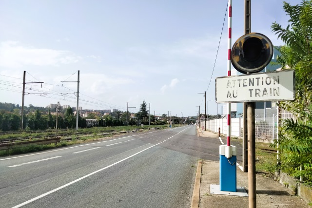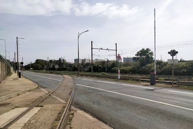 | Commentaire image : Un peu plus loin, un autre embranchement, à double voie et orienté vers le sud, traverse à son tour la rue Henri Moissan (chimiste français, Prix Nobel). Le passage à niveau est protégé par une signalisation automatique lumineuse à franchissement conditionnel (SALFC). | ![]() |