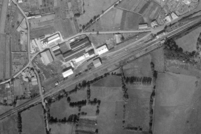 | Commentaire photo - Au nord de la halle marchandises, en 1953, on aperçoit quelques wagons, sur la voie embranchée qui se prolonge en tiroir presque jusqu'au BV. L'usine est alors appelée à considérablement se développer. | |