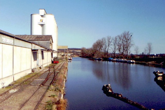 | Commentaire photo - Cette vue date de 1997, époque où l'embranchement était encore actif. Ce silo, ainsi que ceux qui lui font suite en amont du pont de la route de Saint Thibault (derrière le photographe), à l'emplacement de la gare d'eau du tacot, sont unanimement considérés comme les "verrues du paysage sancerrois". | |