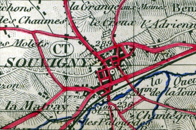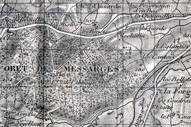 | Commentaire image : La voie se poursuivait, sur 7 km environ, en accotement de l'actuelle D 73. Son parcours se lit bien le long de la "grand'route" (comme on disait alors), contournant par le nord la forêt de Messarges. | ![]() |
