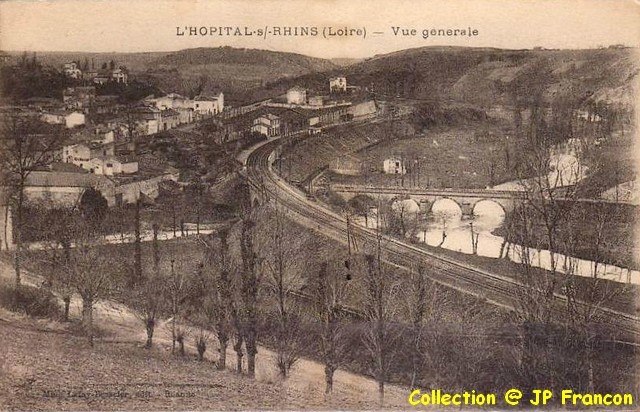 | Commentaire photo : Le confluent des deux rivières est à la jonction de trois communes : Saint Cyr de Favières (où l'on aperçoit la gare de l'Hôpital et qui possédait sa propre station, plus haut, sur la ligne du Bourbonnais), Neaux (au premier plan) et Notre Dame de Boisset (à l'extrême droite). On notera l'admirable tracé en S du remblai. | |