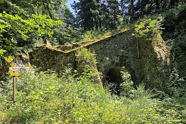 | Commentaire photo : Les ouvrages du funiculaire, ainsi que plusieurs bâtiments de la Bourboule, ont été construits avec la comendite de Charlannes, extraite à proximité de la gare intermédiaire. Cette rhyolite très particulière ne se retrouve nulle part ailleurs. | |