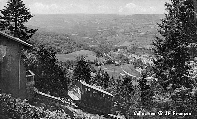 | Commentaire photo : La station supérieure était composée d'un quai, d'un hangar, et d'une simple poulie horizontale renvoyant le câble vers la cabine descendante. Au fond se dessine la vallée d'une Dordogne hésitant encore entre un destin aquitain ou ligérien. | |