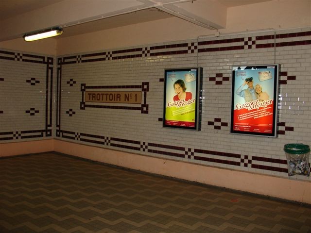 Commentaire photo : Ces faïences sont les témoins des dernières frénésies d'équipement du PLM au début des années 1930. La construction d'infrastructures nouvelles au sud de Vichy et au nord de Gannat s'est accompagnée dans ces deux gares de la mise en place de souterrains dont les murs présentent la même décoration. | |
