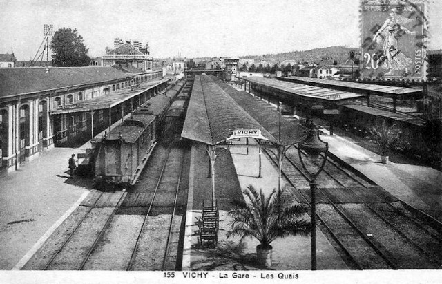 Commentaire image : "Reine des villes d'eaux", "Bayreuth français", Vichy a accueilli des voitures directes en provenance de tous les points cardinaux : Londres, Nantes, Bordeaux, Cerbère, Marseille, Nice, Grenoble, Genève, Strasbourg, Metz, etc... Aucune autre gare française ne peut en dire autant. Là où Morny a échoué avec son Grand Central, Napoléon III, son demi-frère, a réussi avec ses cures : veni vider vessie (devise impériale bien connue). | ![]() |