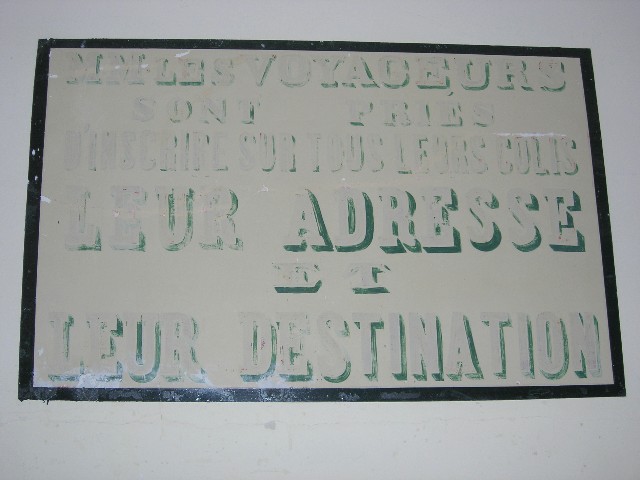 | Commentaire photo : A l'intérieur du BV, devenu propriété municipale accueillant l'Ecole de Musique, on peut encore lire cette affiche, sans objet depuis 1938 : MM les voyageurs sont priés d'inscrire sur tous leurs colis leur adresse et leur destination. | |