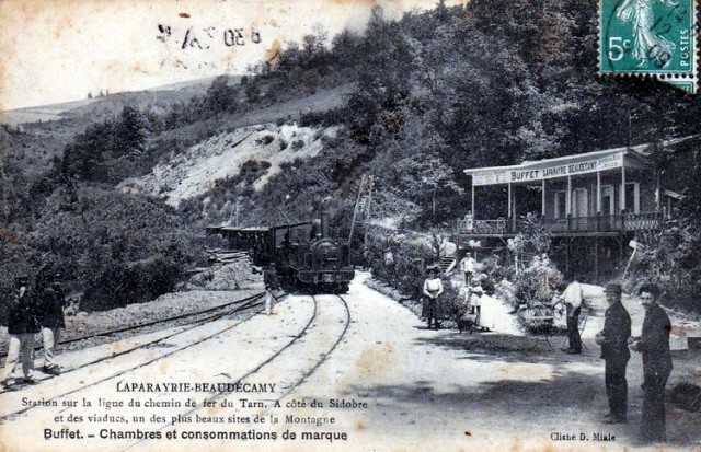 Commentaire photo : Implantée juste à l'aval du confluent de l'Agout et du Gijou, site magnifié par la construction de trois viaducs, également proche des célèbres chaos du Sidobre, la halte fut dotée d'un abri soigné, façon Lacaune, ainsi que d'un chalet-hôtel - rapidement rehaussé - vantant ses "consommations de marque". | |