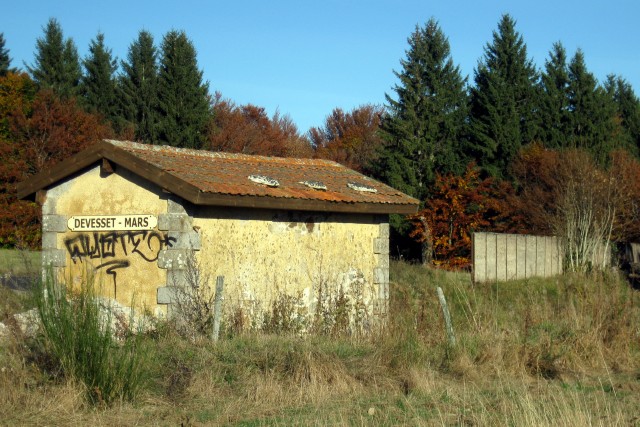 | Commentaire photo : La plaque "Devesset_Mars" date de l'exploitation touristique de la section. On remarque, à droite, en direction de Saint Agrève, le mur anti-neige. | |