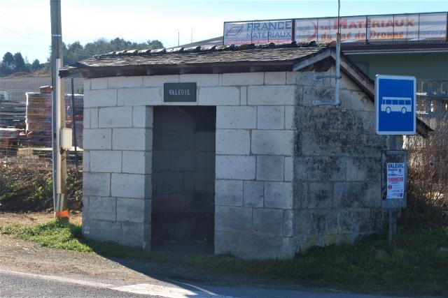 Commentaire photo : L'arrêt facultatif date de 1922. L'abri - atypique - a été construit deux ans plus tard. La plaque n'est pas d'époque. La direction de Brantôme est à droite. | |