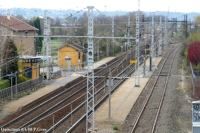 | Observations : La commune de Quincieux comptait jadis deux stations : au nord, quartier du Grand Veissieux, la gare de Quincieux_Trévoux, dont il ne reste pas grand-chose, et, deux kilomètres plus au sud, quartier de la Bourcharlerie, la halte de Quincieux, seule à survivre de nos jours. | |