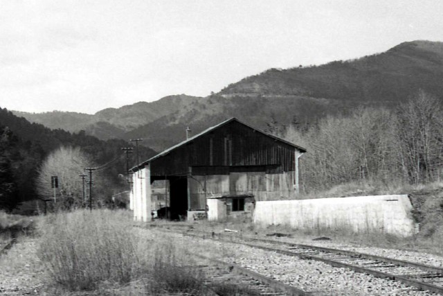 | Commentaire photo - La halle est vue moins de deux ans après la fermeture de la ligne au trafic des marchandises. Au fond, la route de la Corniche des Cévennes ceinture la montagne : le chemin de fer ne lui fera jamais concurrence. | |