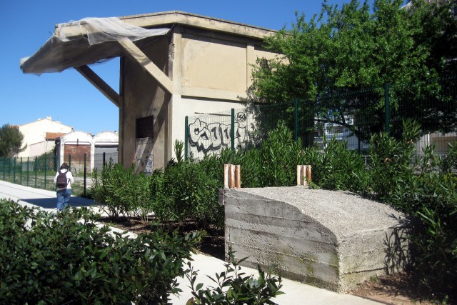 | Commentaire photo - Située en aval de la remise (dont on aperçoit une partie), la halle était de dimension modeste : le gros du trafic concernait les chantiers navals. Sa voie de desserte se terminait par un heurtoir mastoc qui devait tenir le choc. La bétonisation de la Côte d'Azur était lancée. | |