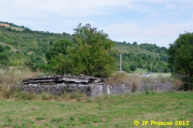 | Commentaire photo - Des installations marchandises, très tôt abandonnées, dès avant la seconde guerre mondiale semble-t-il, il ne reste qu'un soubassement en pierre volcanique. A gauche, se redresse la coulée basaltique au rebord de laquelle s'est accrochée la désormais "Petite Cité de Caractère" du Broc. | |