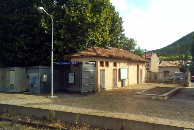 | Commentaire photo - Le comédien Michel Galabru a passé sa jeunesse au Bousquet d'Orb, et l'on ne se gendarmera pas si l'on suppose que le futur adjudant Gerber a eu l'occasion de se soulager ici. L'endroit s'apprête à virer de l'abandon à l'oubli. La direction de Millau est à gauche. | |