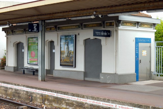 | Commentaire photo - En débarquant sur le quai impair, les banlieusards ressentent effectivement un besoin pressant : celui de rentrer chez eux. Trois raisons au moins invitent d'ailleurs à ne pas utiliser ces "toilettes" : elles sont payantes, elles semblent de toute façon hors-service, enfin, sur la porte, des traces d'"incivilité" poussent à passer rapidement son chemin. | |