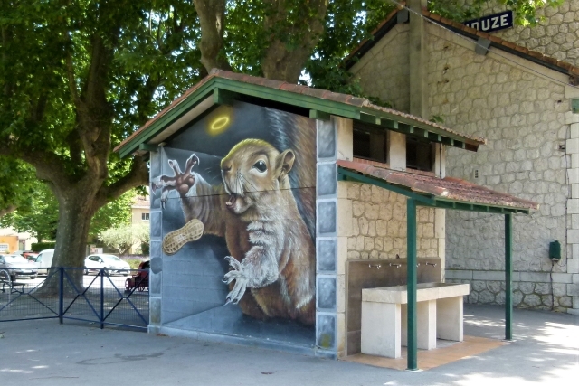 | Commentaire photo - On ne blâmera pas cette amusante fresque en trompe-l'œil, "ouvrant" ce cabinet d'aisance à six sièges. En face, de l'autre côté des voies, l'abri de quai n'a pas fait l'objet des mêmes égards, puisque son toit a été déposé (définitivement?). | |