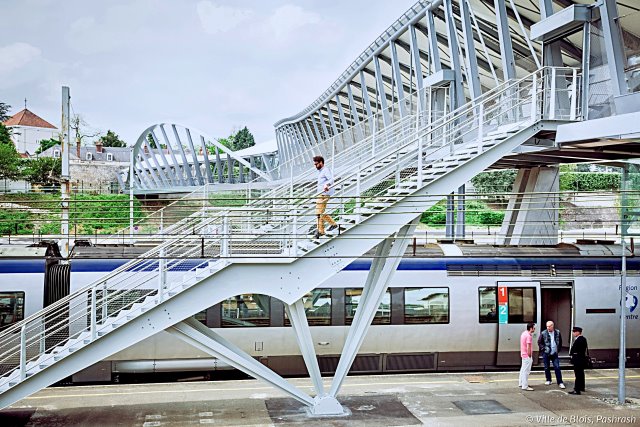 | Commentaire photo - Longue de 140 m, cette passerelle, accessible côté BV par une interminable rampe hélicoïdale, se veut un "geste architectural fort", pas vraiment en phase avec le château de Chambord, dont la gare s'honore du nom. | |