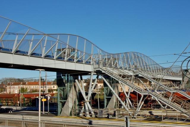 | Observations - Cette passerelle, longue de 75 m sur 4 travées, a été mise en place par la Communauté d'Agglomération en 2011 : franchissant la limite entre les deux communes, elle offre une liaison douce entre Moulins et Yzeure. Dix ans plus tard, la gare a été "mise en accessibilité" : quais réhaussés et abris requalifiés. | |