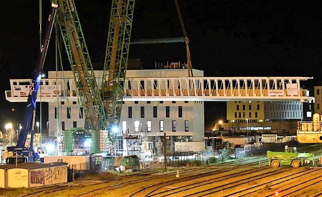 | Commentaire photo - Le premier des deux tronçons de la passerelle est en cours de mise en place. Son ouverture au public était attendue pour juin 2023. En toile de fond, on distingue le nouveau quartier d'affaires en chantier sur les anciens terrains du Sernam. | |