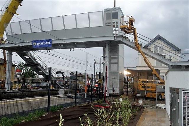 | Commentaire photo - En avril 2023, à l'occasion d'une opération coup de poing sur la ligne, une passerelle et deux blocs d'ascenseurs ont été érigés. Par ailleurs, un parking de 120 places s'étend désormais sur le plateau marchandises. | |